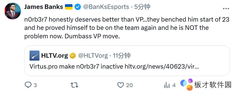 “说实话,n0rb3r7理应得到比VP更好的待遇……2023年初他们就把他下放替补席,后来他又证明了自己能重回战队,而现在问题根本不在他身上。VP这步棋真的太蠢了。 ”