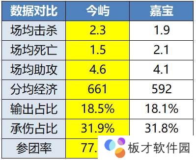 而今屿今晚的对手嘉宝,在小组赛的表现也同样谈不上亮眼,KDA在淘汰赛打野选手里排名倒数第二,参团率也同样是末流。英雄池方面,嘉宝坦野的胜率要明显优于野核,夏侯惇5战3胜,阿古朵2战全胜。至于镜和大司命,一个50%胜率场均1-1.5,一个3战仅1胜。在今晚的BO7里,对嘉宝的英雄池无疑是个巨大的考验。